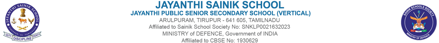 Jayanthi Sainik School, Jayanthi Public Senior Secondary School (Vertical) Arulpuram Tirupur Tamilnadu is an CBSE based curriculam, English medium